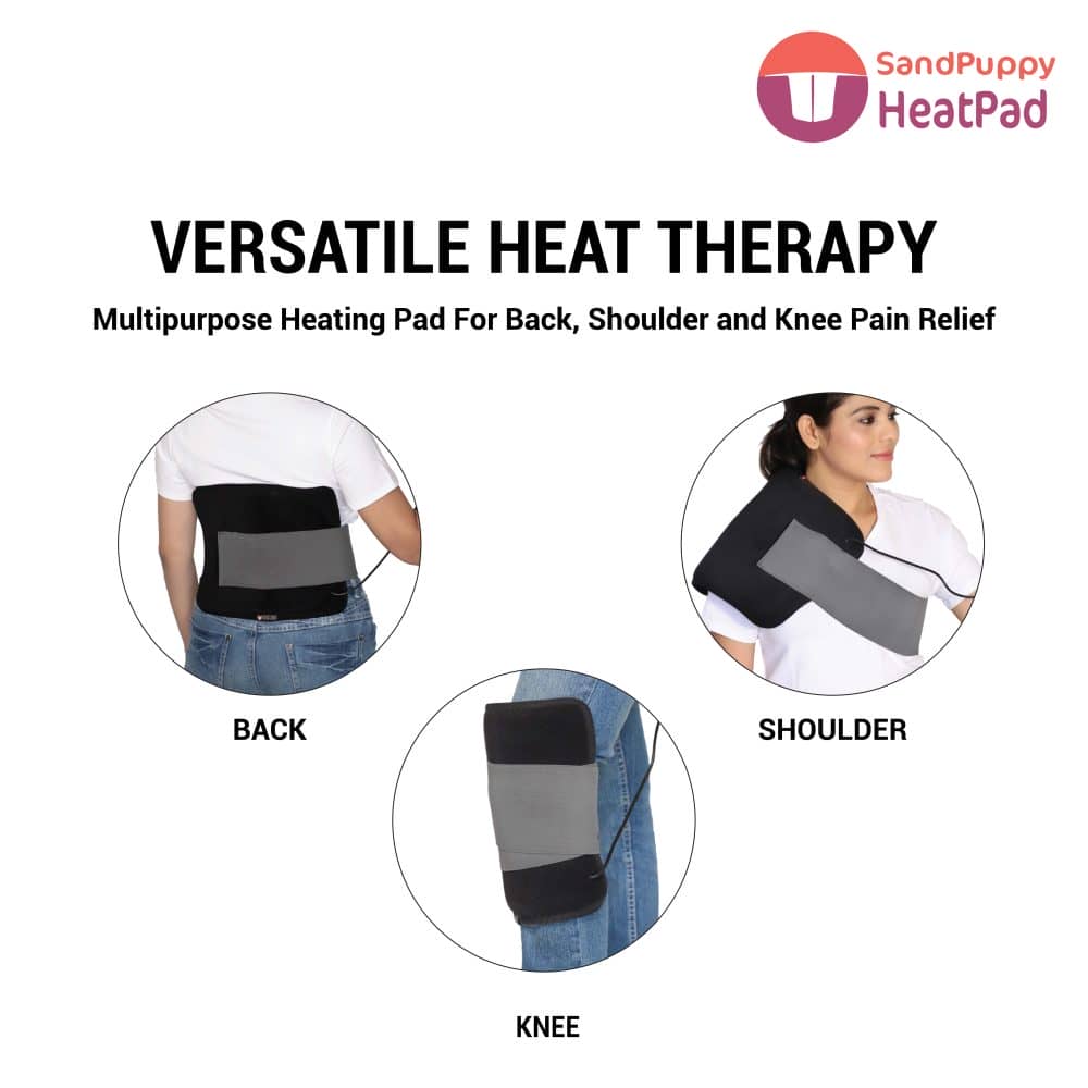 HEATING PAD FOR BACK, KNEE & SHOULDER – SandPuppy Heatpad is ideal for back pain, knee pain & shoulder pain relief. This can be used by people with chronic pain, senior citizens, home makers & athletes. This is useful in certain medical conditions such as sciatica, spondylosis, spondylolysis, rheumatoid arthritis, osteoarthritis, osteoporosis & slipped disc
