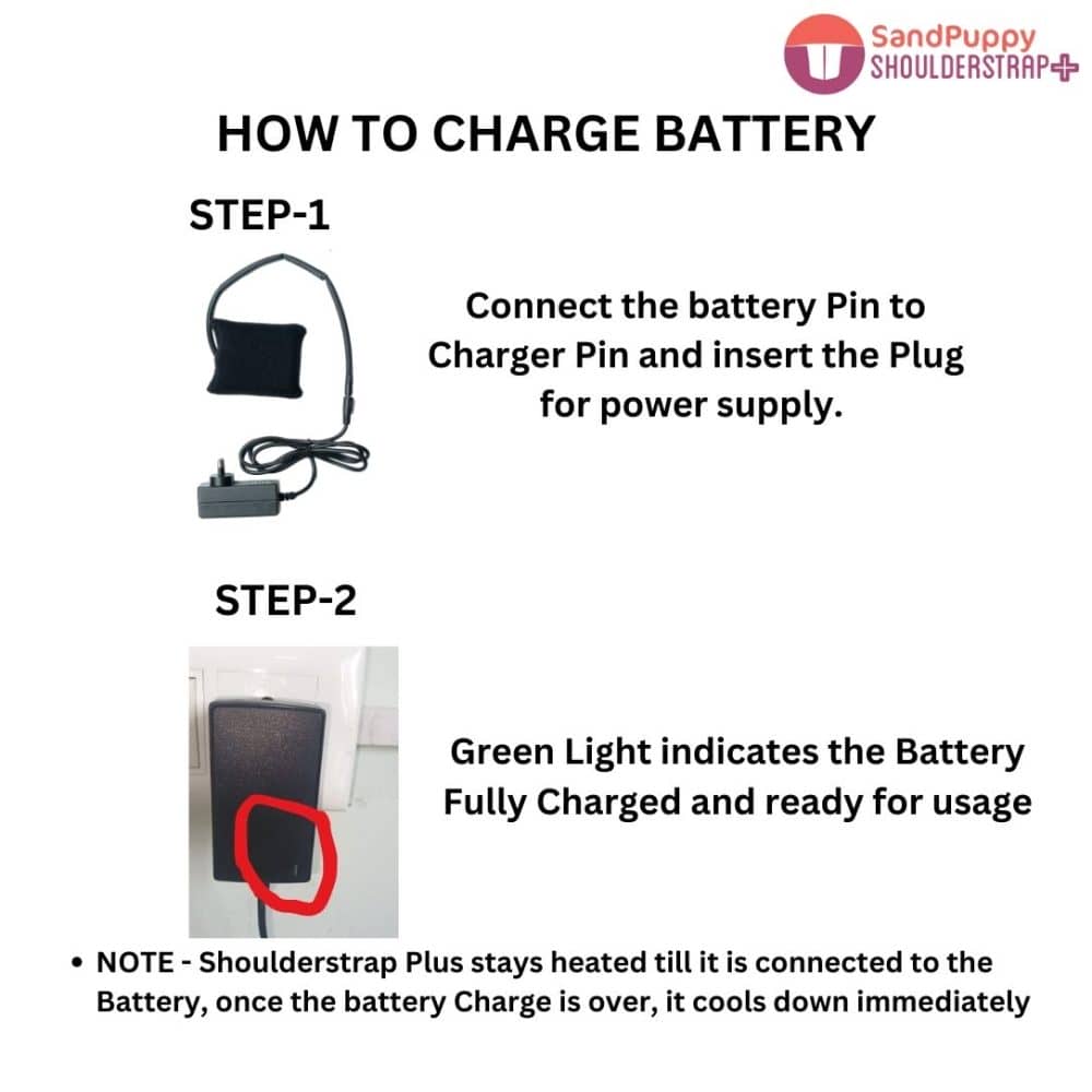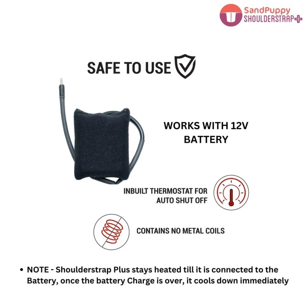 NOTE – Shoulderstrap Plus stays heated till it is connected to the Battery, once the battery Charge is over, it cools down immediately
