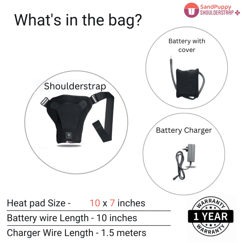 SandPuppy Shoulderstrap Plus is a strappable heating pad that is ideal for shoulder pain relief by providing targeted heat therapy. Shoulderstrap Plus comes with a contoured design & stretch strap band that enables you to give a snug fit around the shoulder. The design makes it easy to wrap around the right or left shoulder. Shoulderstrap heat therapy can be used to relieve pain from muscle injury & spasms, arthritis, meniscus tear, sports injury or general fatigue. Shoulderstrap heat therapy works on Far Infrared technology by deep tissue penetration and increasing the blood circulation around the area. This helps in faster healing and longer lasting effects. Shoulderstrap Plus is battery-powered, which makes it safe for use every day even by the elderly. Each time battery charge lasts for 60 minutes of use. SandPuppy products are covered with a 1 year replacement warranty against all manufacturing defects. Shoulderstrap Plus offers an easy-to-operate switch that lets you control the heat on three levels- High, Medium, Low and experience instant pain relief. Shouldestrap is powered by a 12V DC step- down Battery that is designed for safe use.